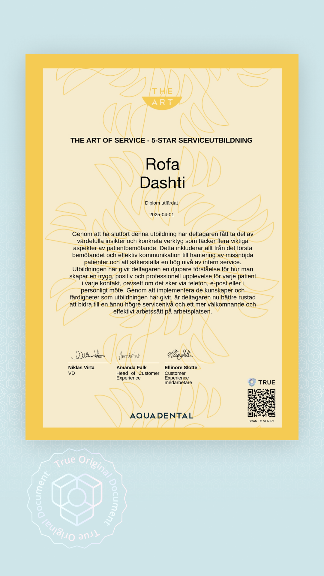 Alla TRUE -document är säkrade med blockchain-teknologi och kan verifieras som äkta. Klicka på verifieringsknappen bredvid dokumentet eller skanna QR-koden med din smartphones kamera. Ingen app krävs - dokumentets äkthet verifieras omedelbart.